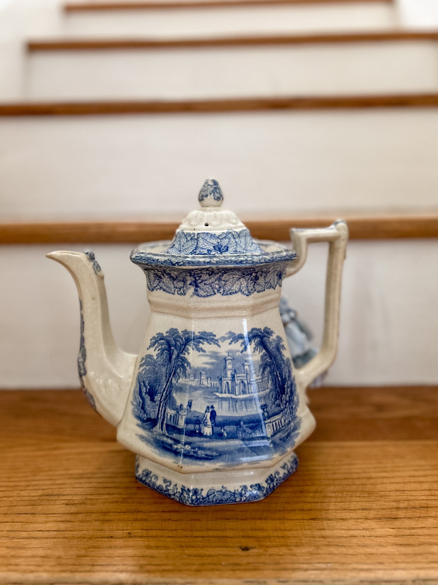 19th-Century Staffordshite Blue and White Transferware Teapot w/ Tassle