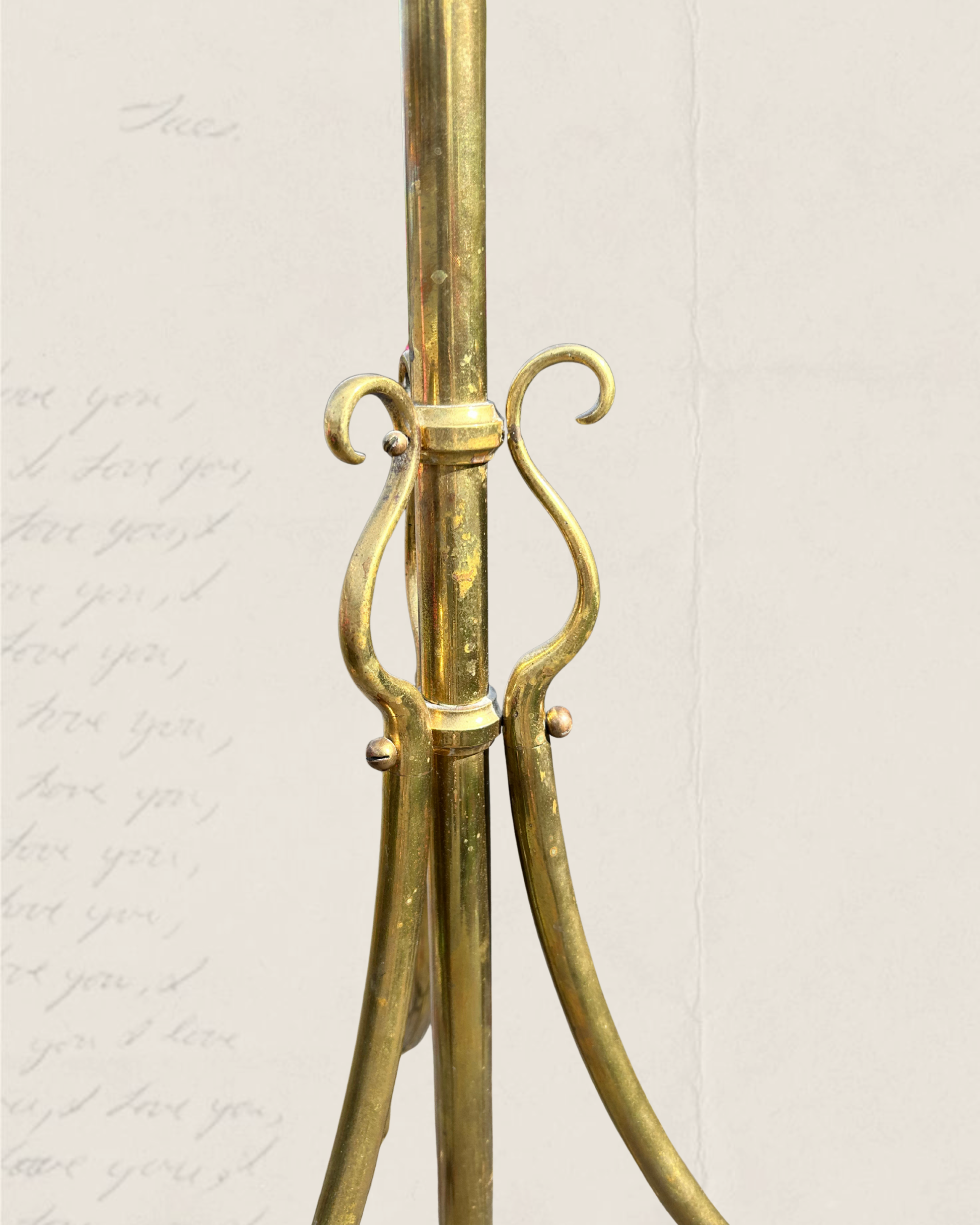 A late 19th to early 20th-century adjustable brass cheval mirror with elegant tripod base and scrolled finial detailing. The circular mirror pivots on a ball joint, allowing the angle to be easily adjusted for use. Its design reflects the refined craftsmanship of Continental dressing mirrors, often used in fine boudoirs and ateliers.