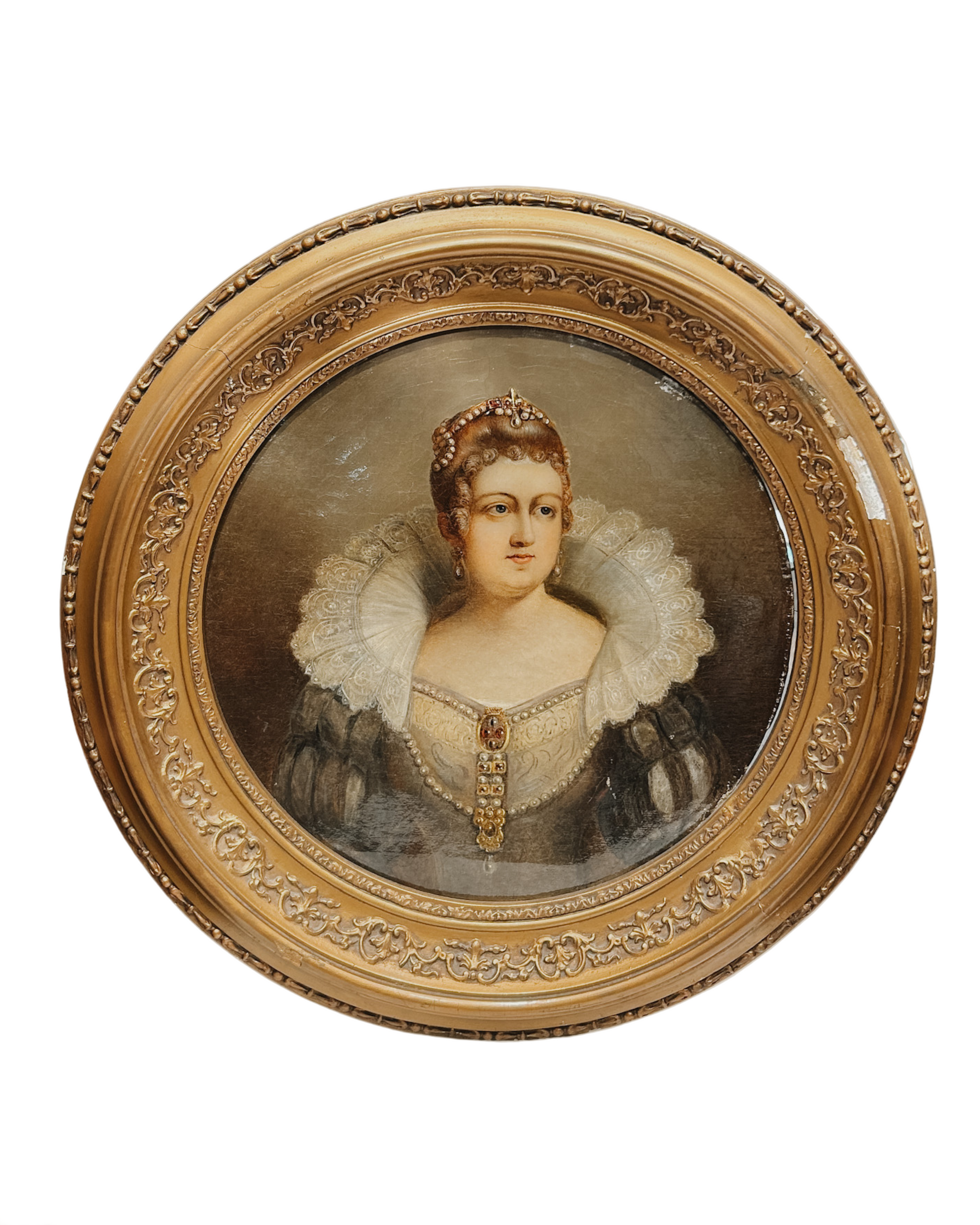 An 18th/19th-century Continental School oil on canvas portrait depicting Marie de Medici (1575–1642), Queen Consort of France and wife of King Henry IV. She later served as regent for her son, Louis XIII, and became one of the most influential women of her era. A devoted patron of the arts, she famously commissioned the Marie de Medici Cycle from Peter Paul Rubens, now displayed in the Louvre.