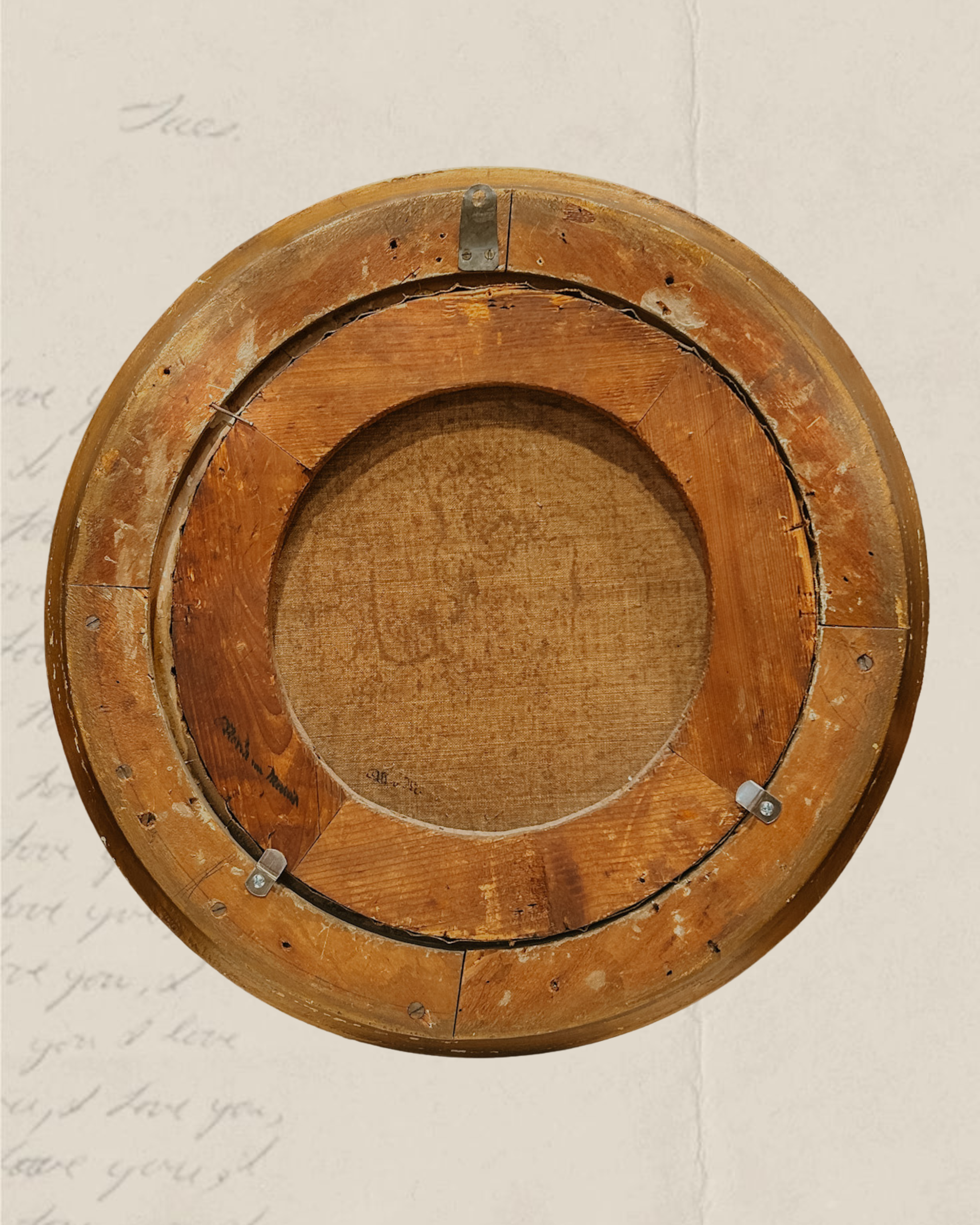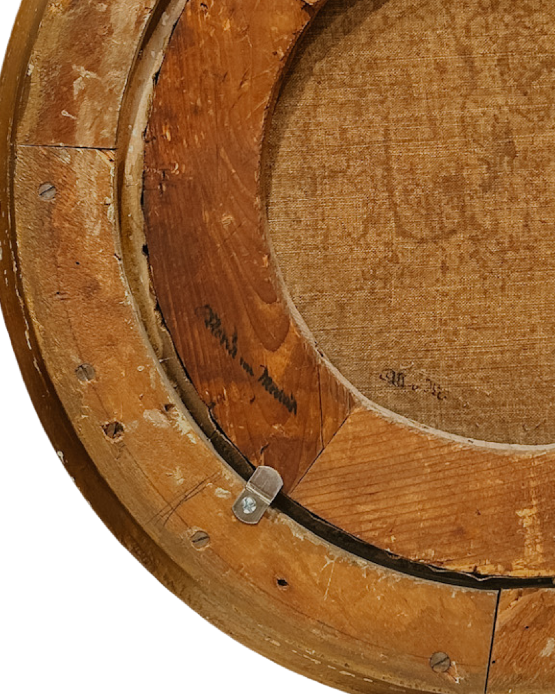Surface craquelure and light wear to frame, including one chipped section at upper right. Overall stable and well preserved with crisp detail and elegant coloration.