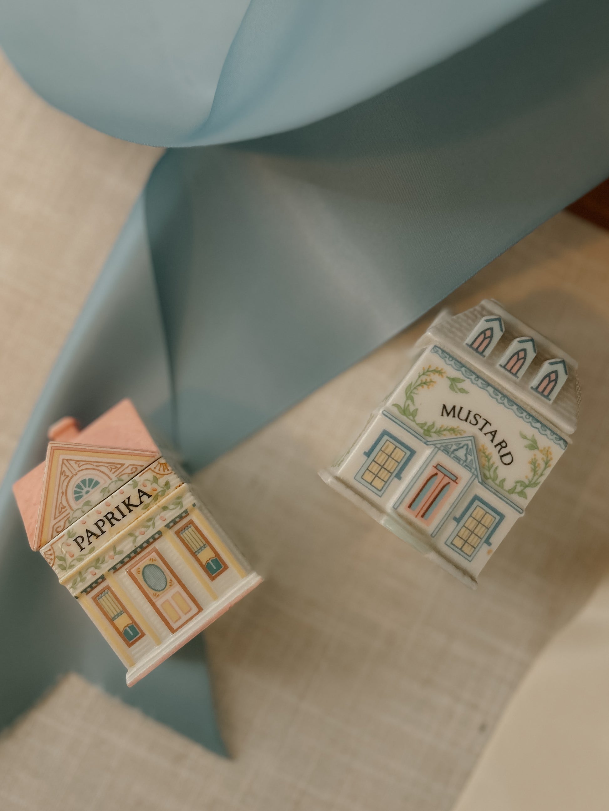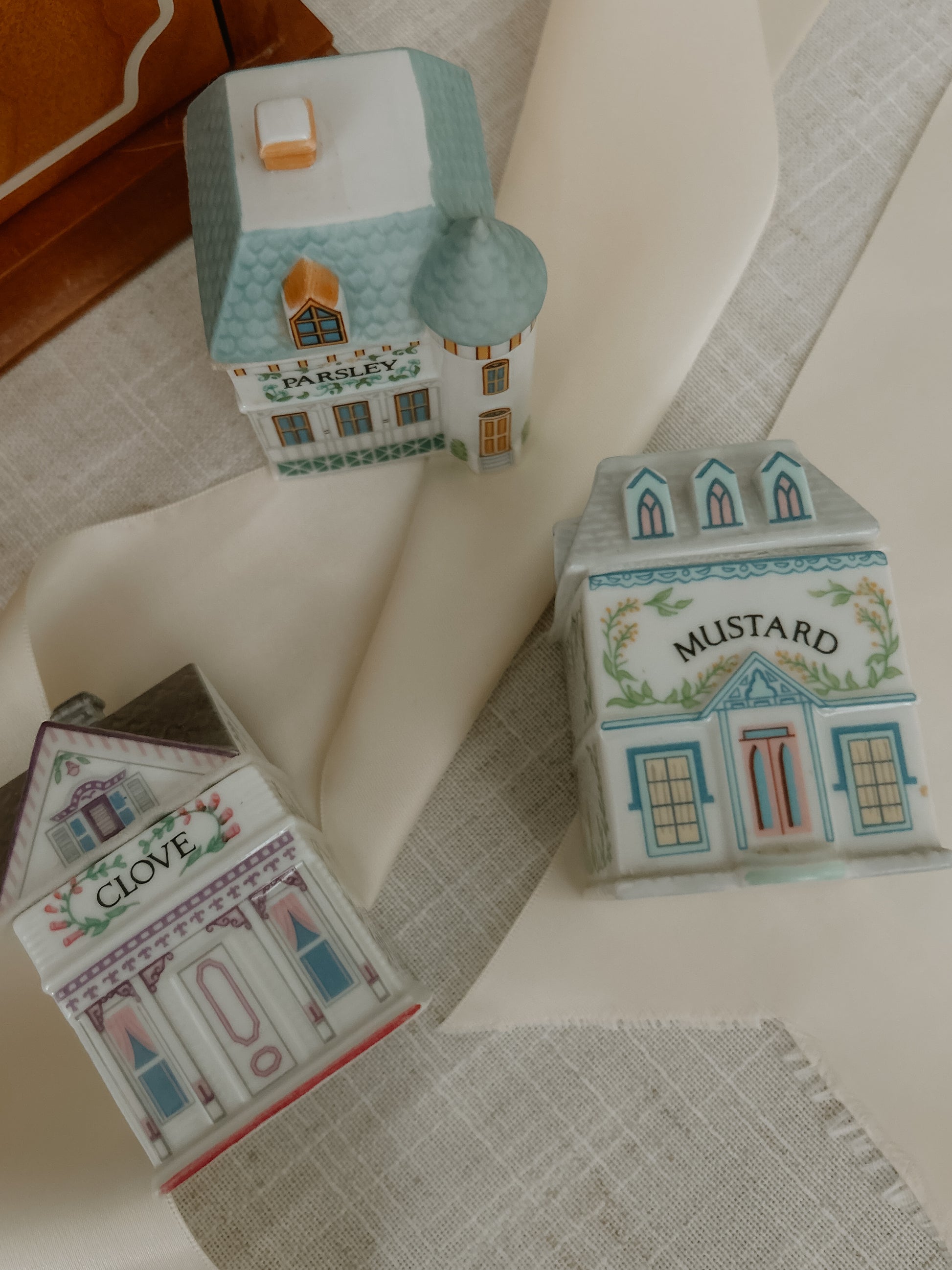 A complete set of 1989 Lenox porcelain spice jars, each crafted in the form of a charming miniature house and labeled with the name of a different herb or spice.