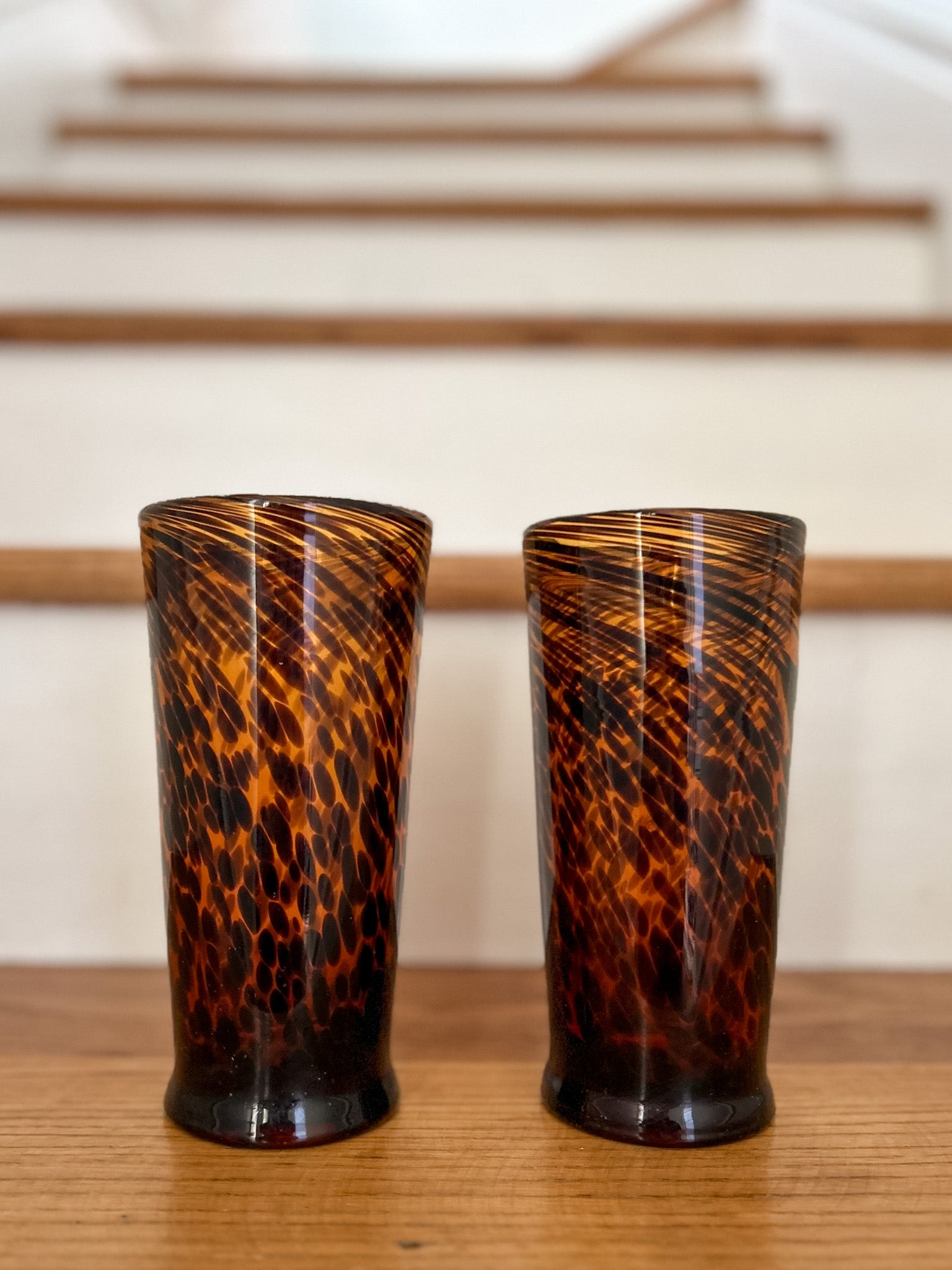 Description: TWO AVAILABLE. Vintage blown-glass vases in a mottled tortoiseshell pattern of amber and dark brown. Their tall cylindrical form makes them versatile for flowers or as sculptural accents on shelves and tables.
